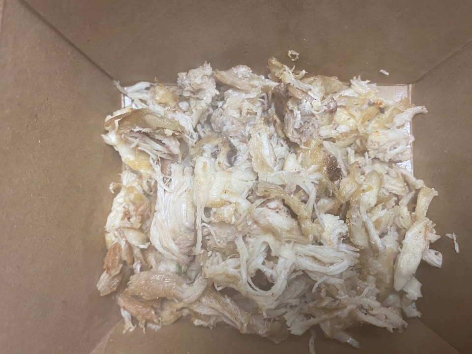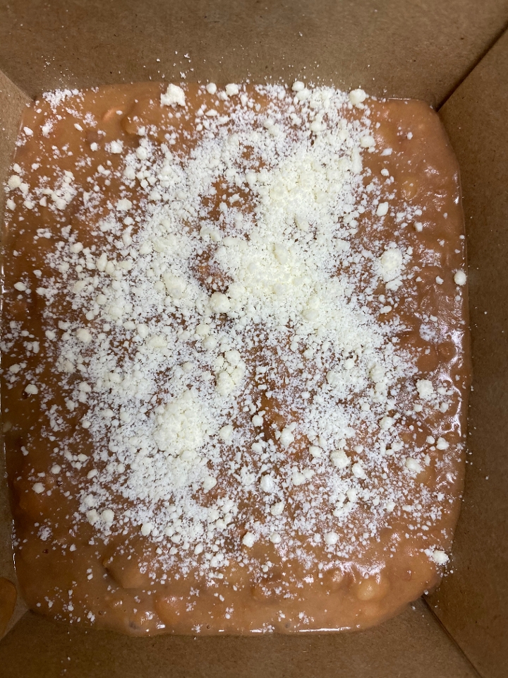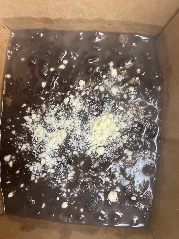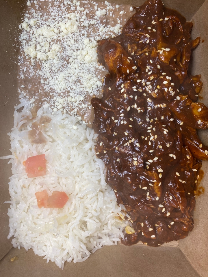 Shredded chicken thighs grilled, then tossed in mole negro. Served with refried beans, rice and tortillas.