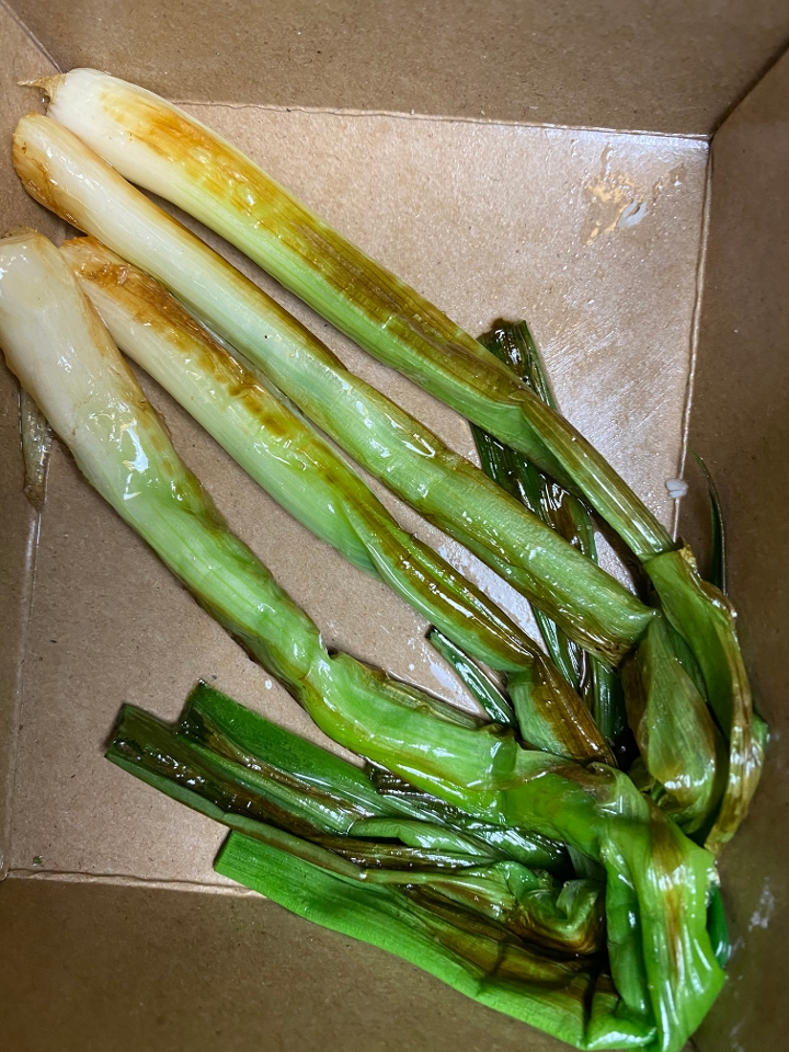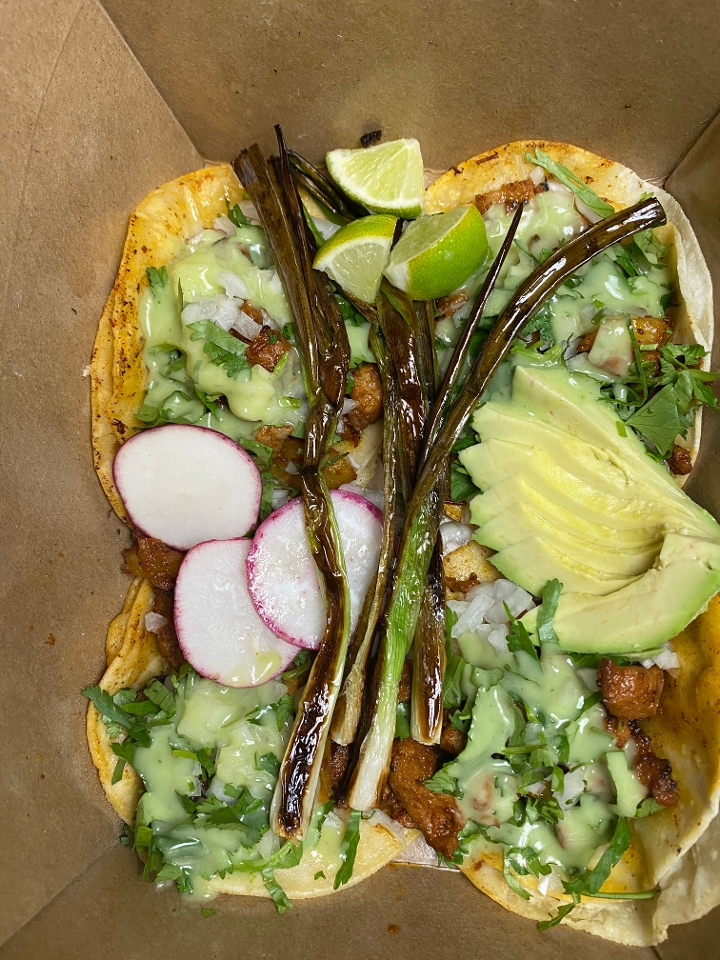 Four shredded crispy brisket tacos topped with salsa, onion, cilantro. Garnished with grilled green onions, radishes, limes and avocado