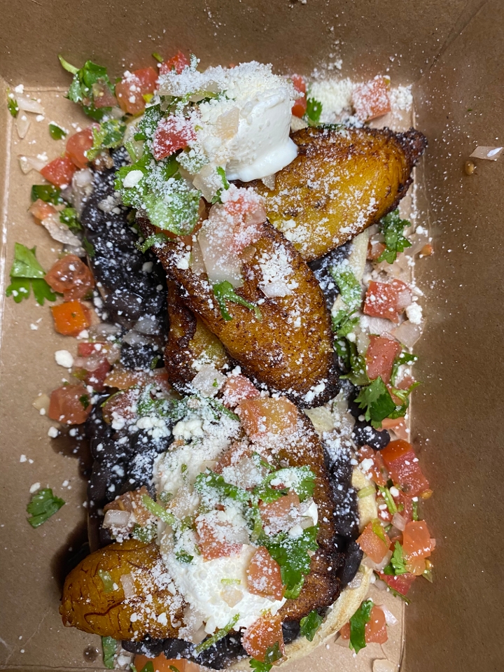 Two Masa cakes topped with black beans, plantains, cream and cheese topped with salsa Fresca.