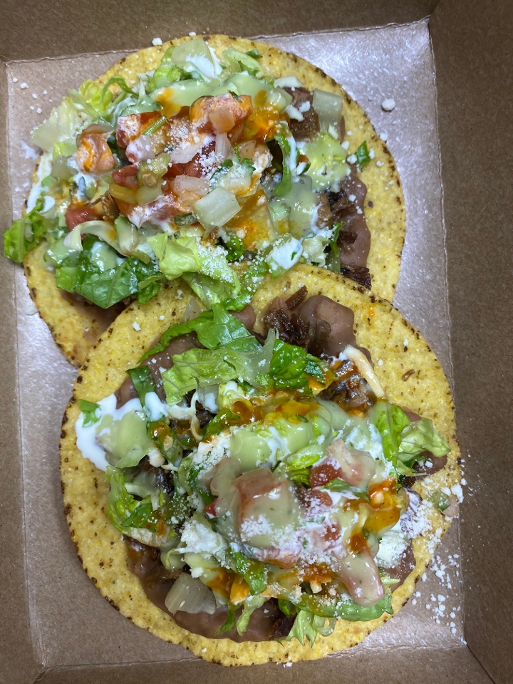 Crispy corn tostadas covered in refried beans, lettuce, salsas and cotija cheese.