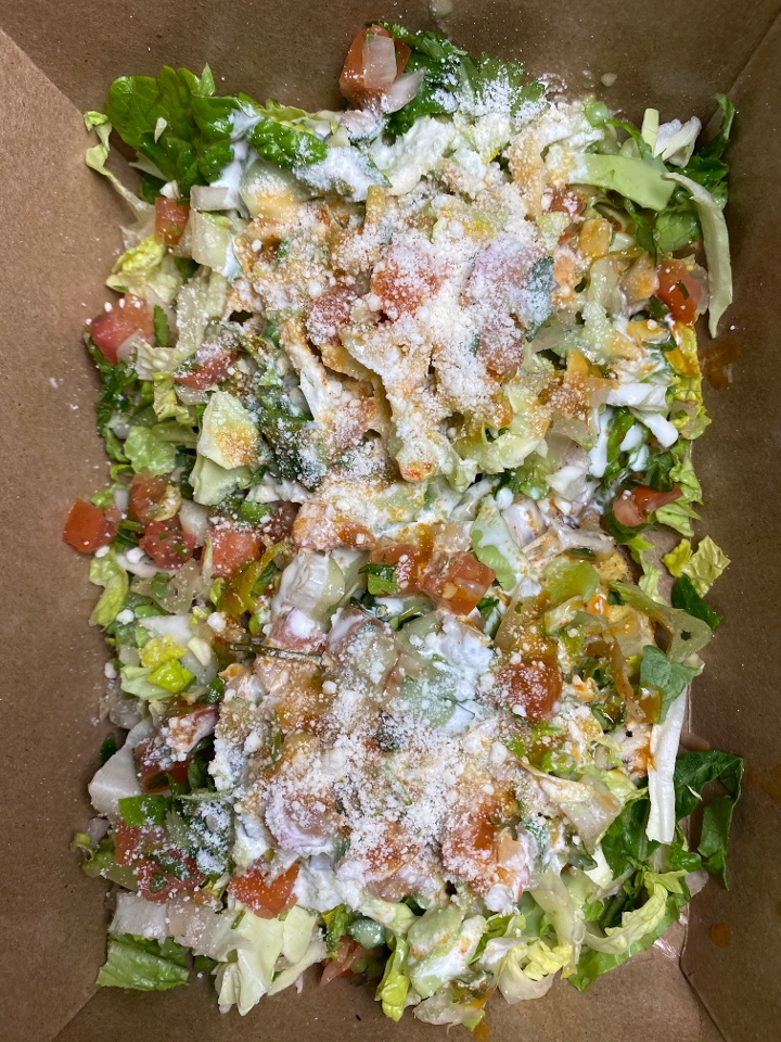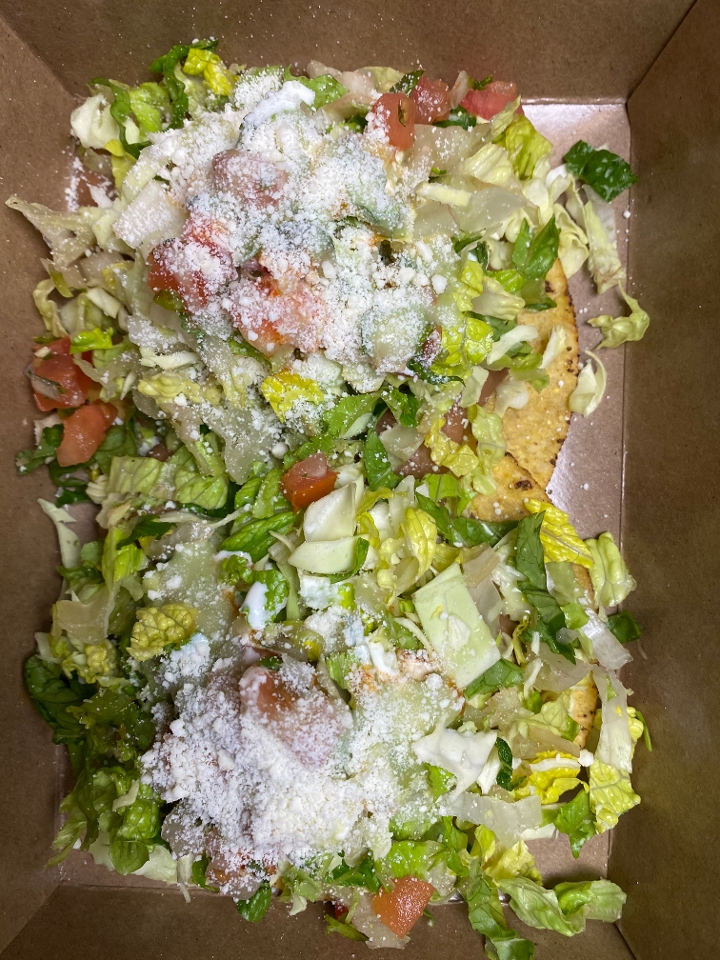 Crispy corn tostadas covered in refried beans, guacamole, lettuce, salsas and cotija cheese.