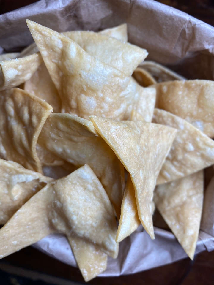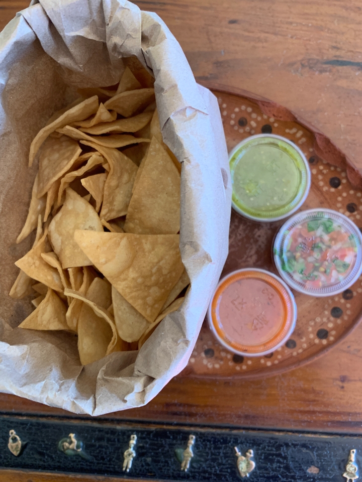 Freshly fried tortilla chips served with a red salsa, green salsa and salsa fresca