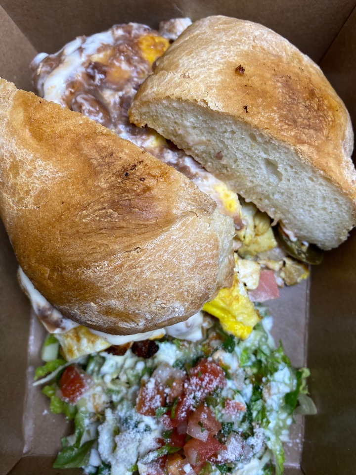 Toasted roll layered with refried beans, lettuce, cabbage, tomato, jalapeño, avocado. With your choice of carnitas, egg, carne asada, machaca or panela cheese.