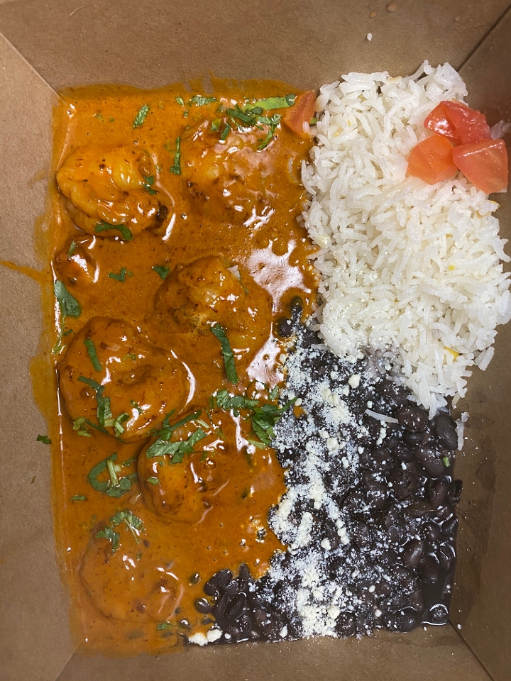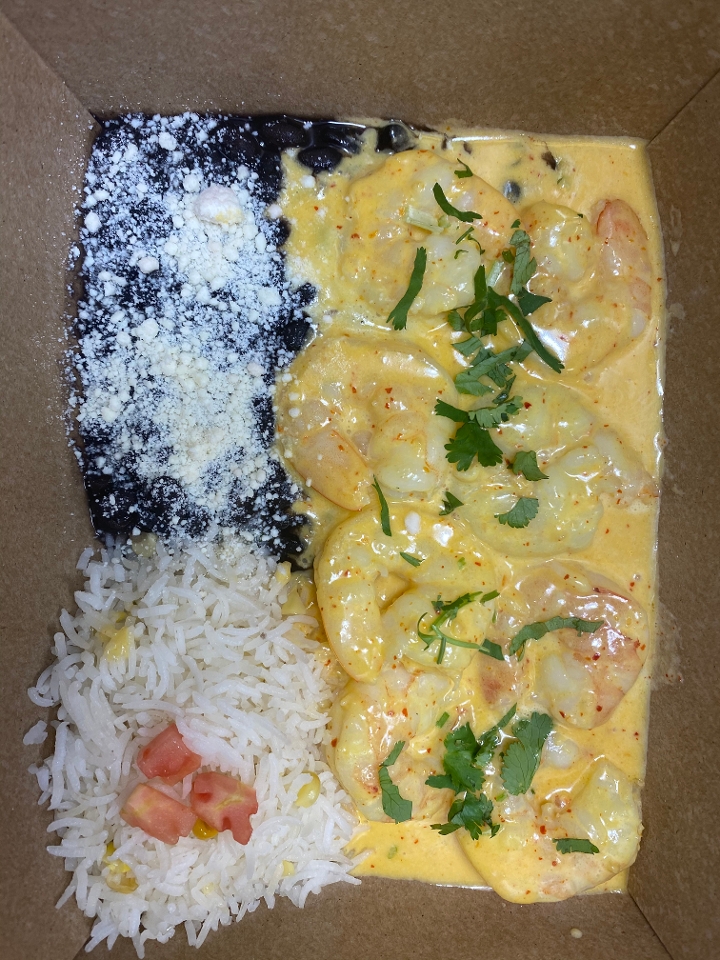 Shrimp sautéed and finished with tequila cream sauce and a dash of chile. Served with rice and black beans.