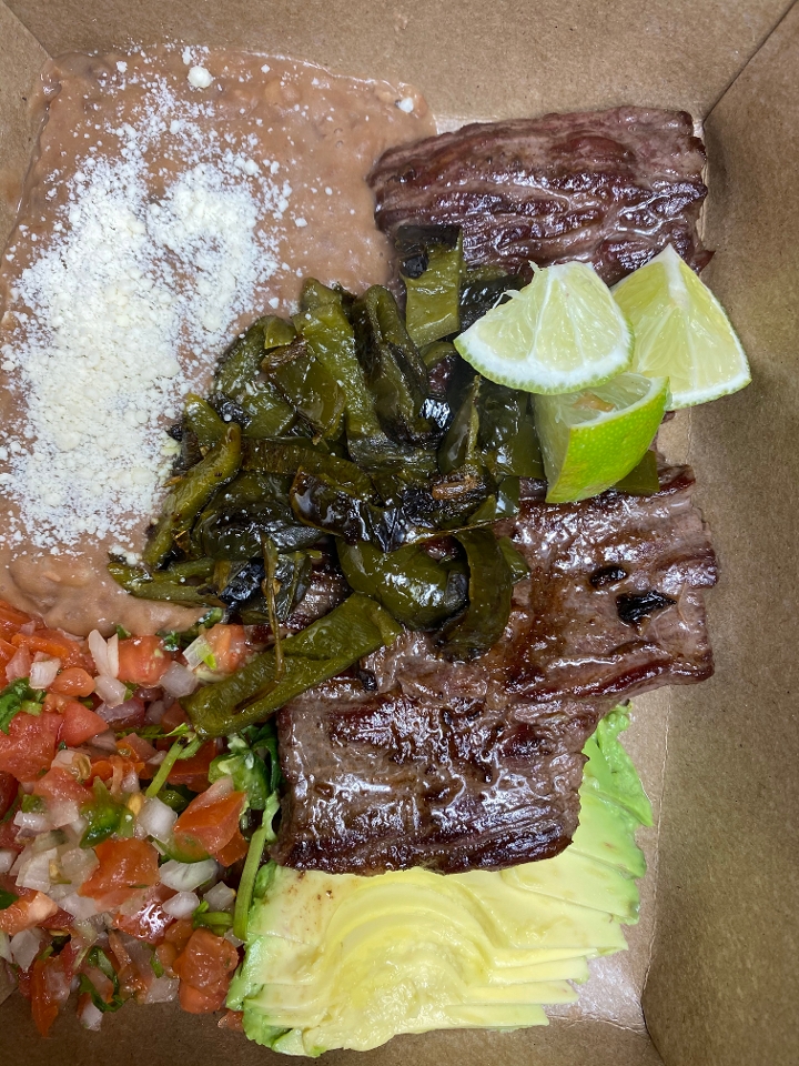 Seared skirt steak grilled poblano chiles, salsa fresca, avocado, rifried beans and tortillas.
