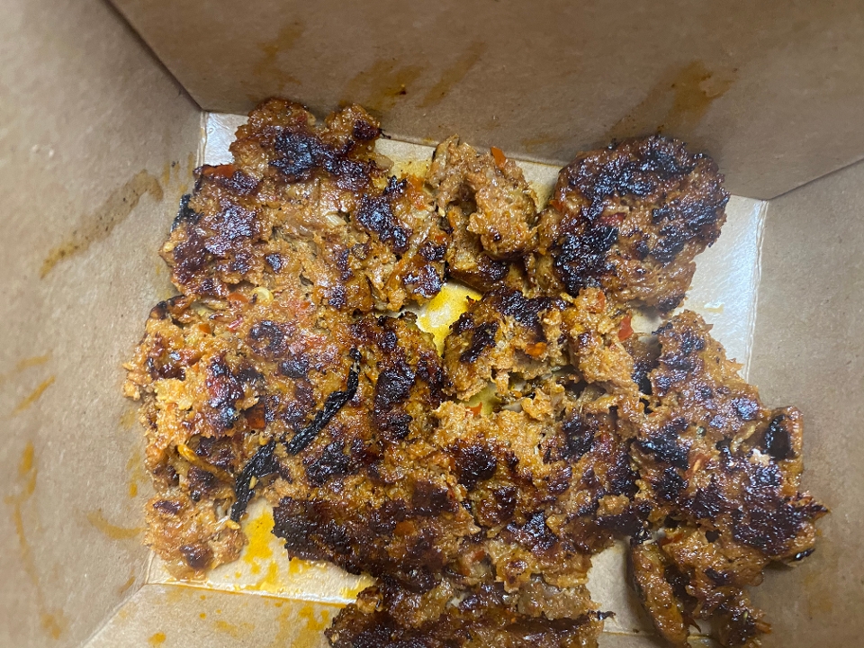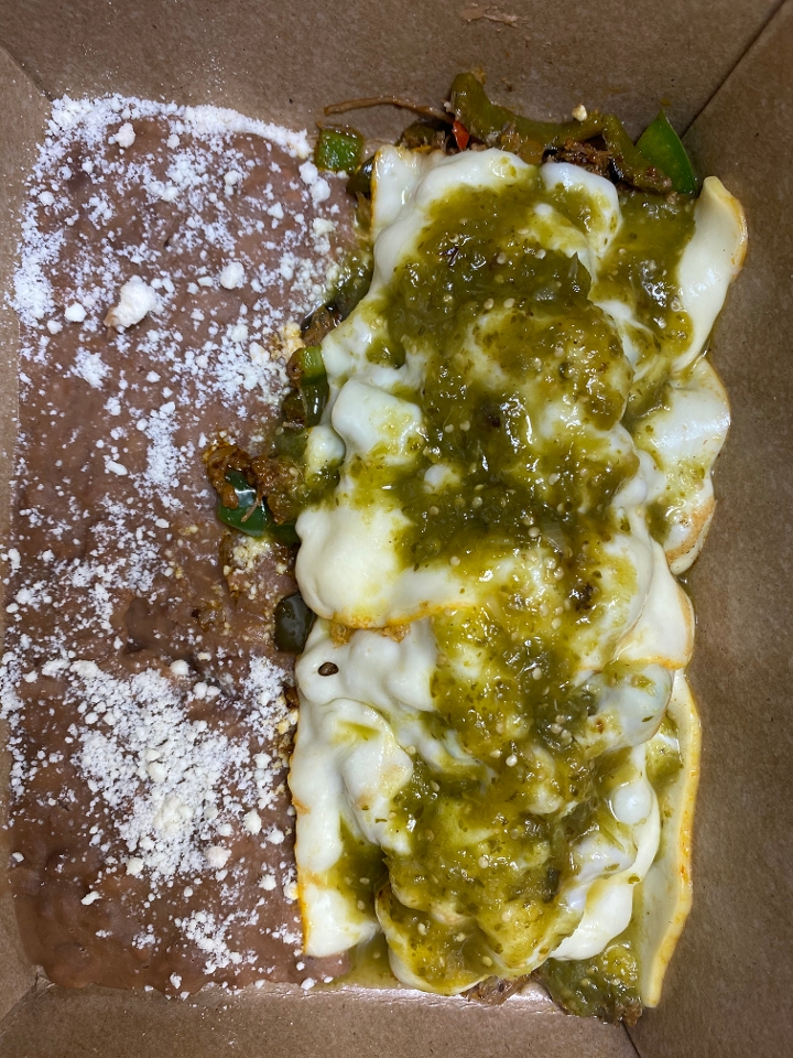 Shredded beef, chorizo, green bell pepper, and poblano chile grilled together and topped with cheese. Served with refried beans.
