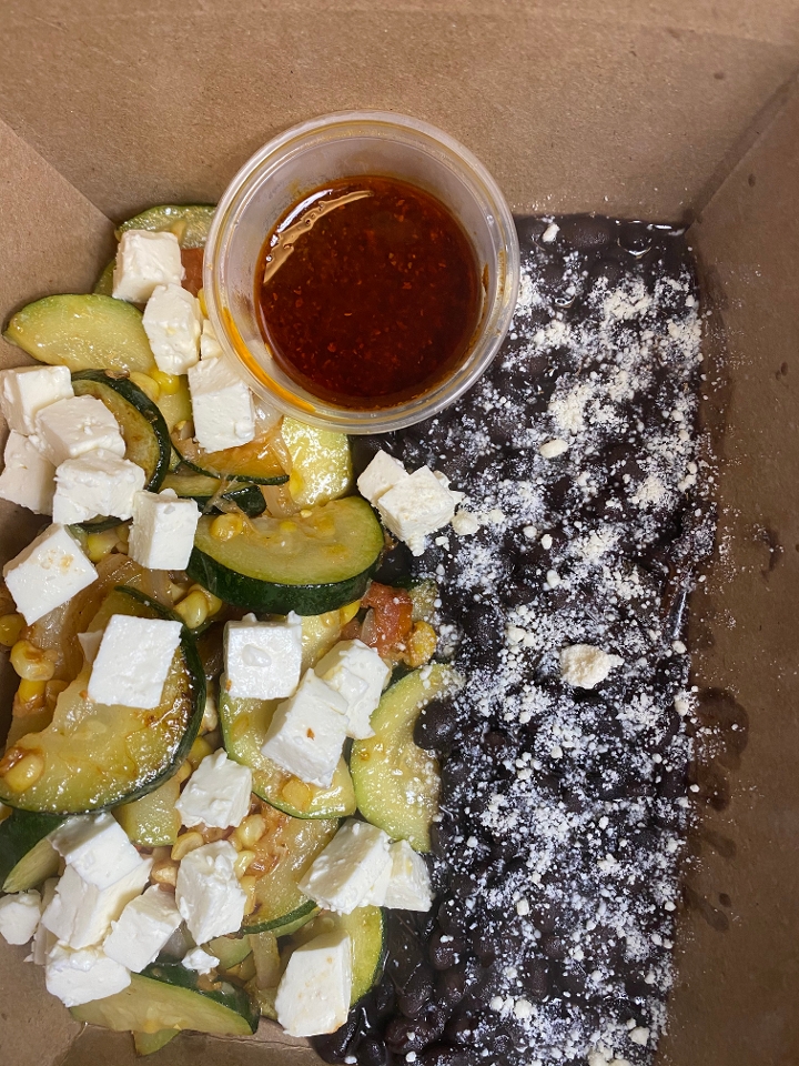 Zucchini, corn, and onion stewed together and topped with panela cheese. Served with black beans and tortillas.