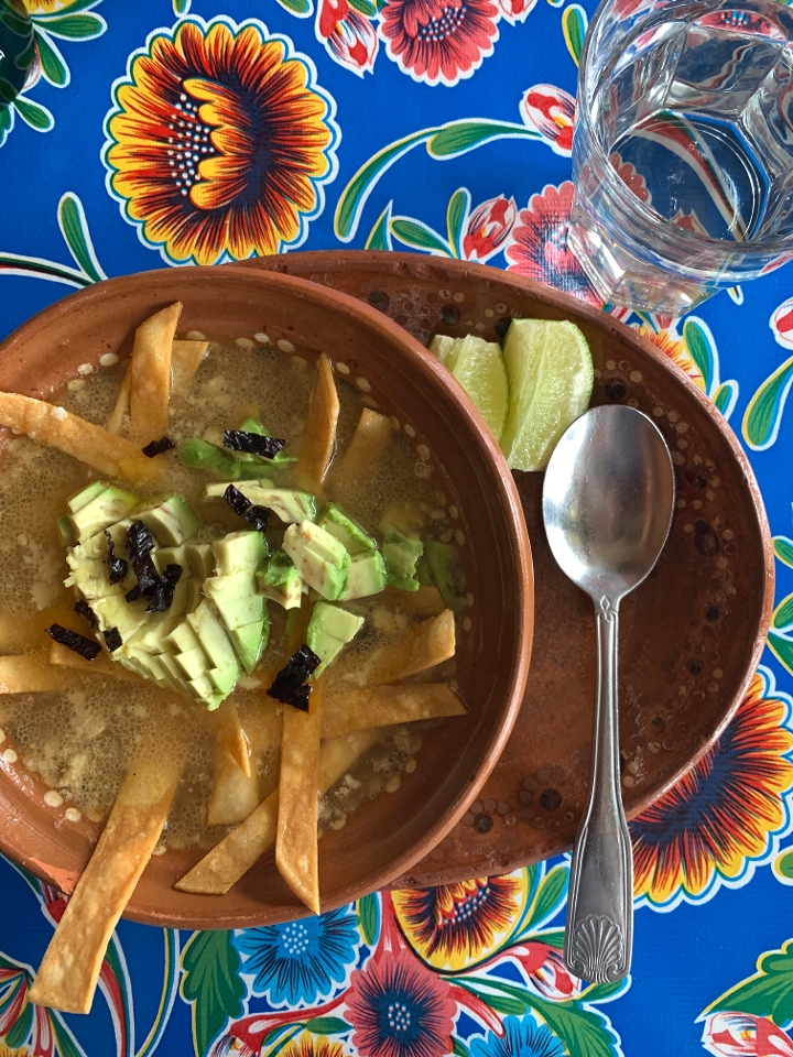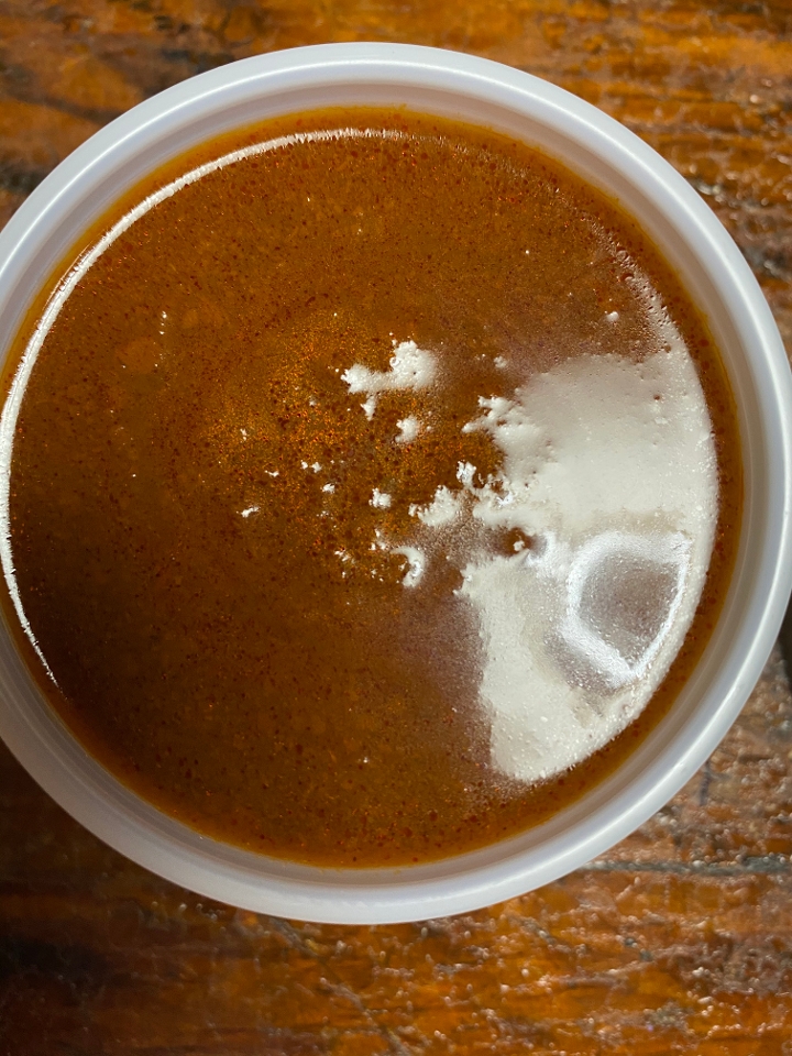 Tomato based broth with chicken and topped with crispy tortilla strips.
