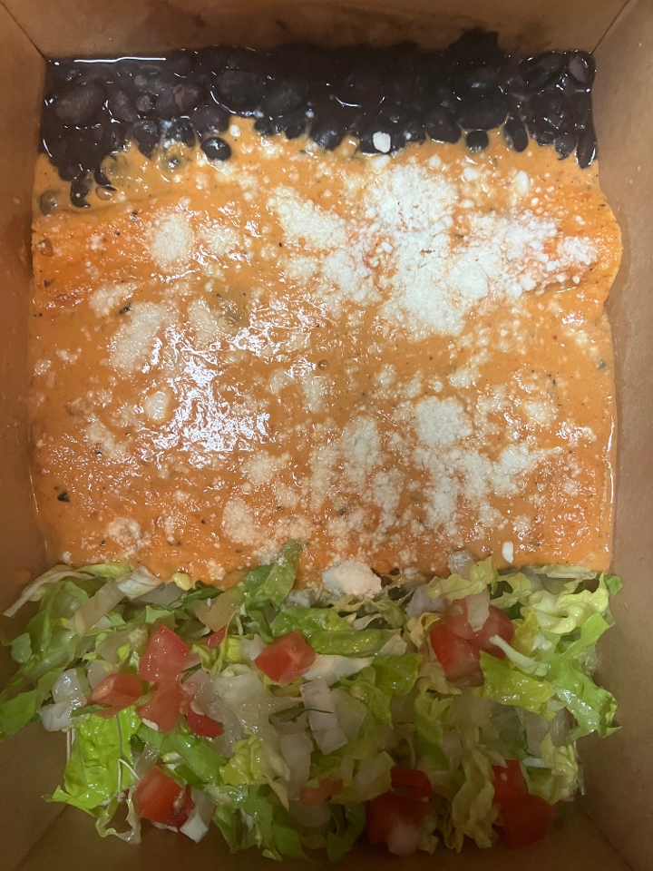 Tortillas filled with two cheeses, smothered with a creamy spicy salsa de puya. Served with black beans.