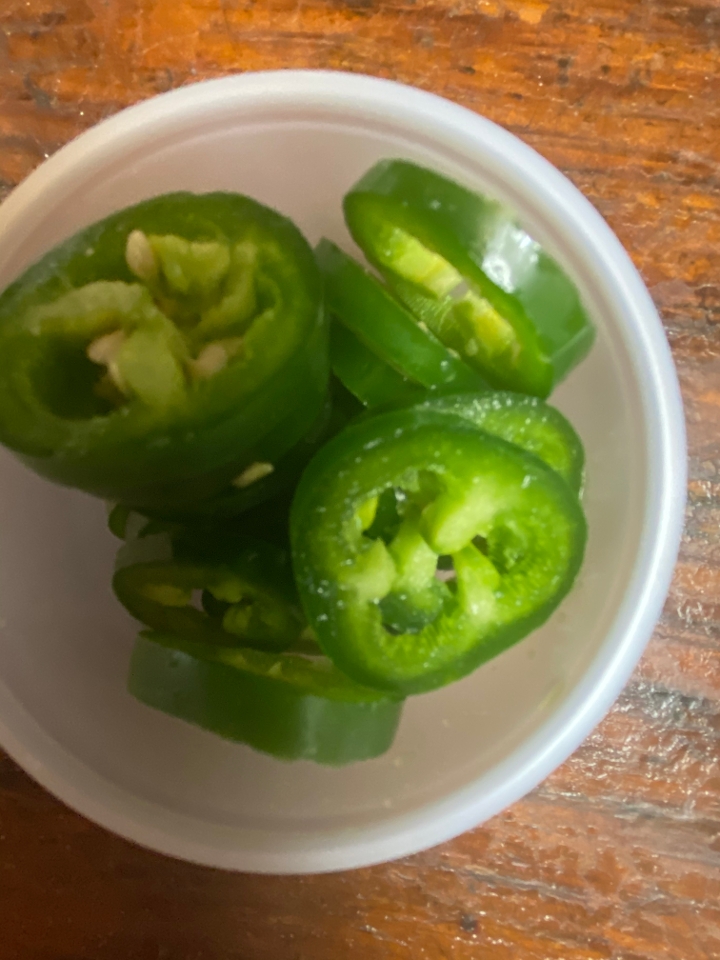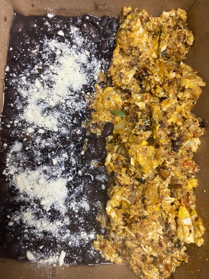 Eggs scrambled with jalapeno, onion and tomatoes. Severed with black beans and tortillas.