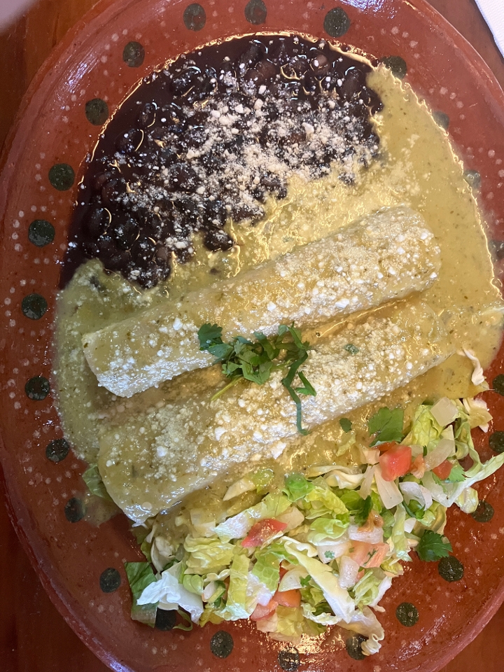 Tortillas filled with chicken in creamy green salsa. Served with black beans and some shredded salad.