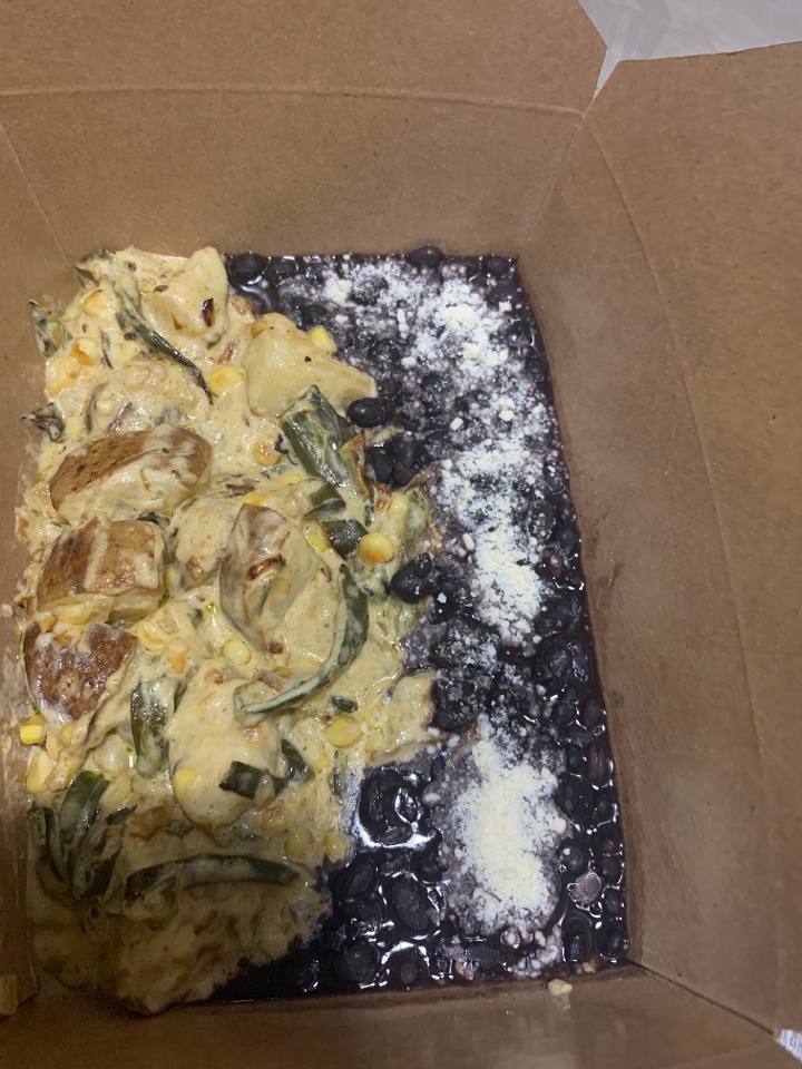Potatoes, roasted poblano chiles, corn, and onions lightly sauteed then cooked in cream sauce. Served with black beans and tortillas.