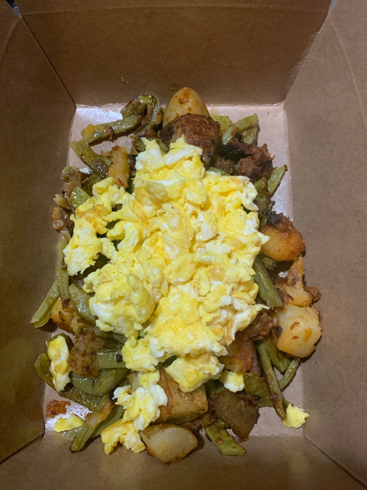 Potato, chorizo and cactus hash topped with any style eggs and served with tortillas.