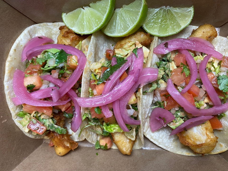 Three Mahi Mahi beer battered fried fish, with slaw and pickled red onions *gluten free. Puerto Vallarta style!
