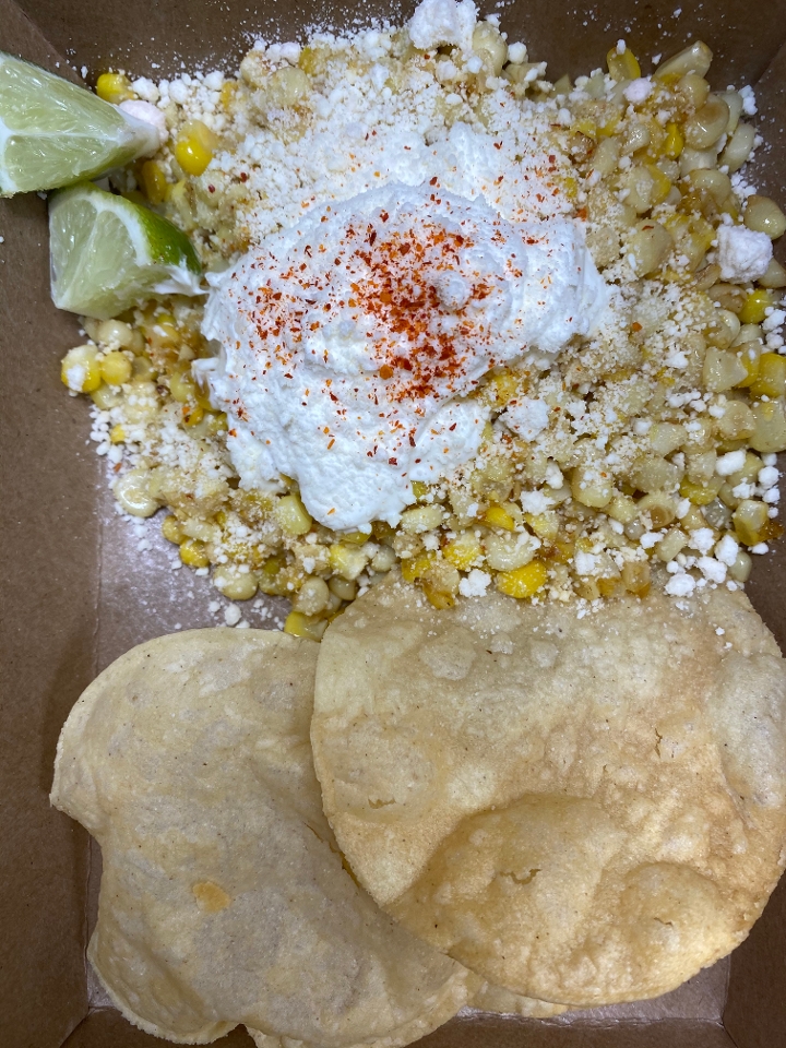 Fresh corn cut off the cob with lime, chile, epazote, cheese and cream served with house-made tostadas