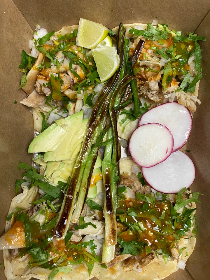 Four chicken tacos topped with salsa, onion, cilantro and garnished with grilled green onions, radishes, limes and avocado