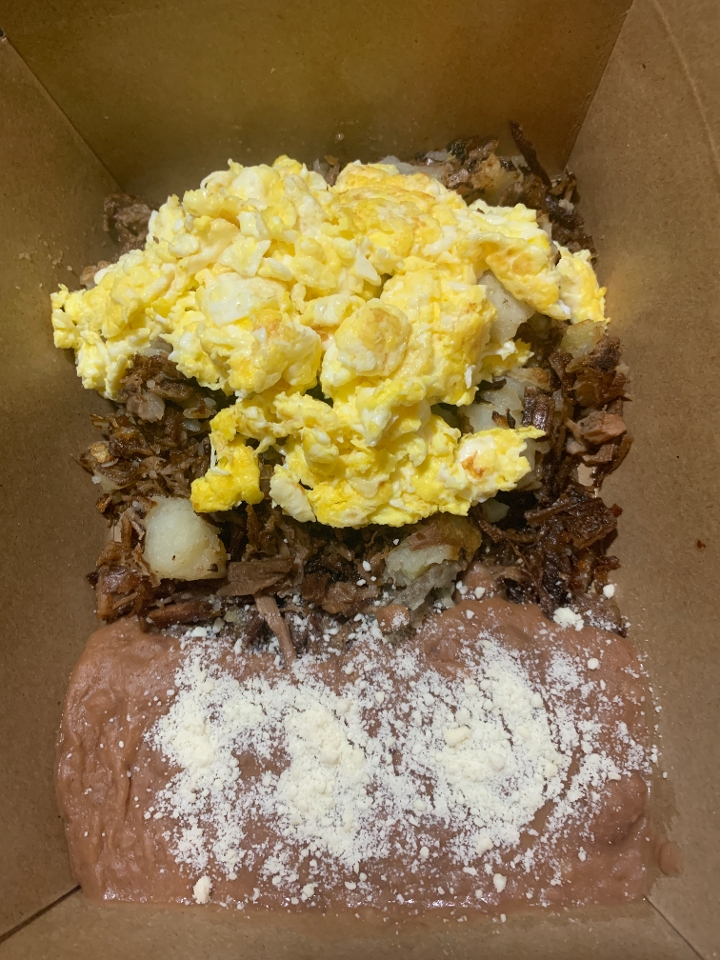 Crispy beef brisket and potatoe hash. Topped with two eggs any style. Served with refried beans and tortillas.