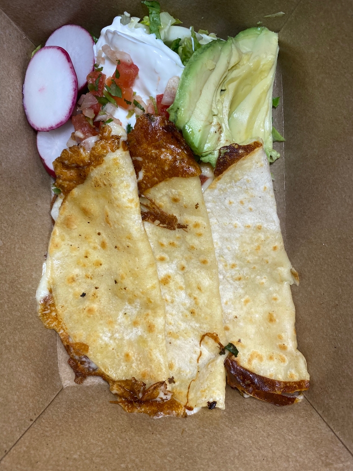 White corn tortillas crammed with lots of melty cheese and beef brisket. Severed with side salad, cream and avocado.