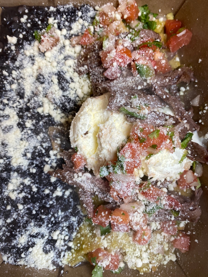Fresh tortilla chips tossed in your choice of green or red sauce toped with carne asada, cream, cheese and salsa. Served with black beans.