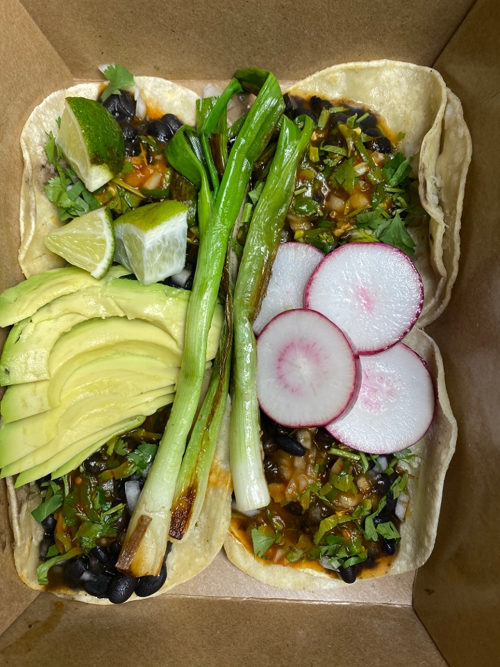 Four black bean tacos topped with salsa, onion, cilantro and garnished with grilled green onions, radishes, limes and avocado