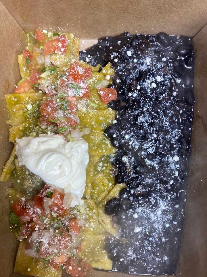 Fresh tortilla chips tossed in your choice of green or red sauce toped with chicken, cream, cheese and salsa. Served with black beans.