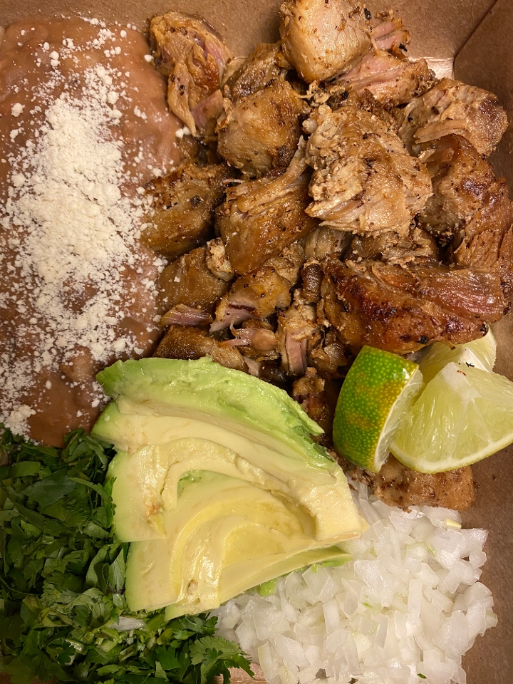 Crispy, moist pork served with avocado, beans, and tortillas for making tacos.