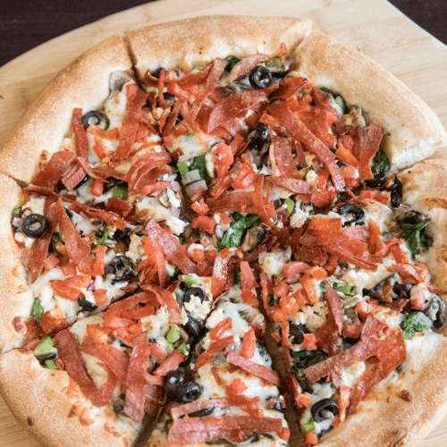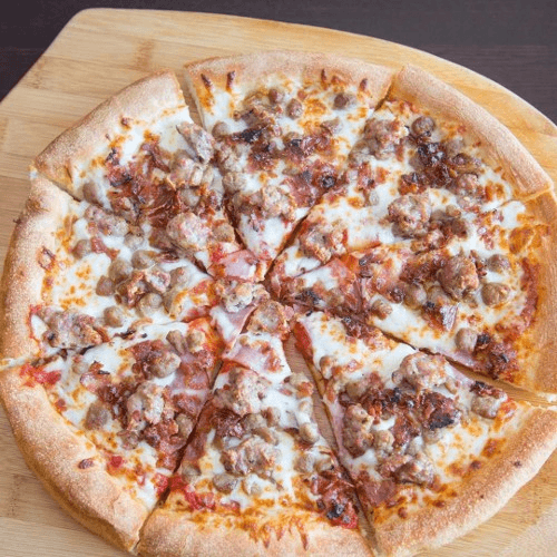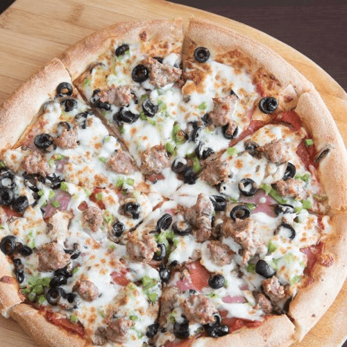 Pepperoni, ham, Italian sausage, mushrooms, black olives, green peppers, mozzarella cheese & pizza sauce