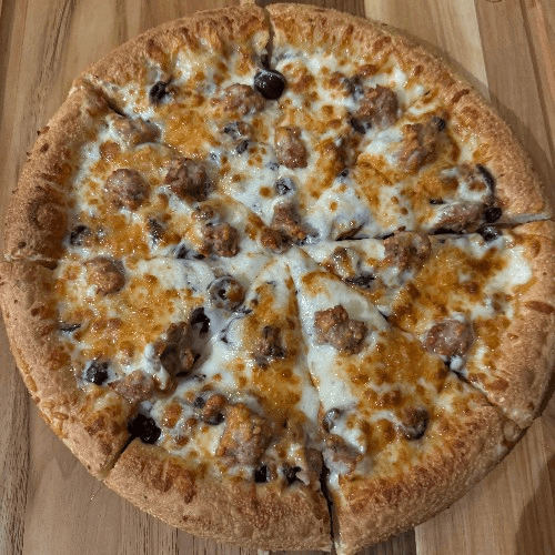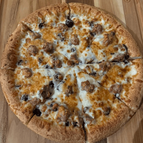 Sausage, Greek olives, garlic, basil, mozzarella, parmesan cheese & olive oil (no pizza sauce)
