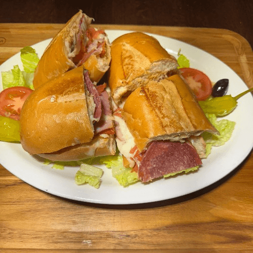 A mountain of greens & assorted cold meats, salami, pepperoni, ham, Greek olives, pepperoncini, mozzarella, feta & tomatoes with your choice of dressing