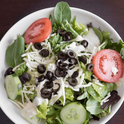 Tomatoes, cucumbers, red onions, pepperoncini, green peppers, feta cheese & Greek olives with house (Italian) dressing