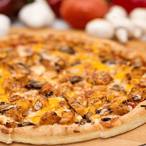 Pizza sauce base, BBQ chicken, mushrooms, red onions, mozzarella & cheddar cheese
