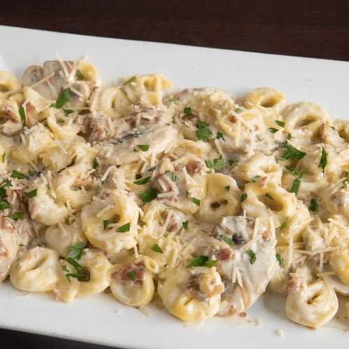 Cheese filled tortellini, bacon, mushrooms, home-made Alfredo sauce, and parmesan