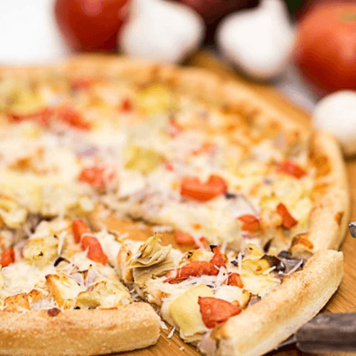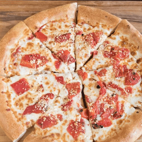 Goat cheese, roasted red peppers, fresh garlic, mozzarella cheese & pizza sauce