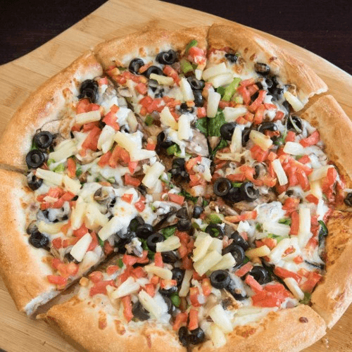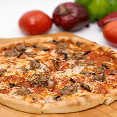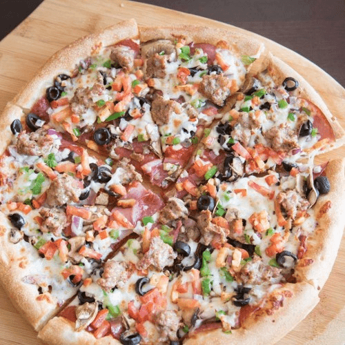 Salami, pepperoni, ham, mushrooms, black olives, onions, green peppers, Italian sausage, fresh tomatoes, mozzarella cheese & pizza sauce