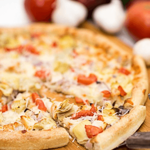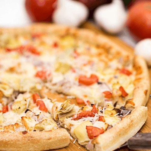 Garlic ranch sauce, grilled chicken, artichokes, onions, tomatoes & mozzarella