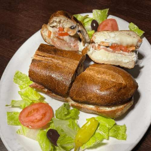 Tender chicken breast, marinara, mushrooms, onions, parmesan & mozzarella