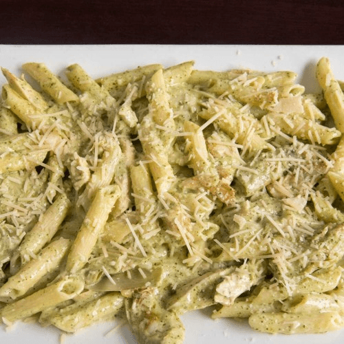 Penne pasta, chicken, garlic, artichokes, creamy pesto sauce