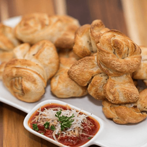 Strips of our famous pizza dough tied up in little knots, stuffed with fresh garlic, olive oil & baked to perfection. Served with parmesan & marinara sauce