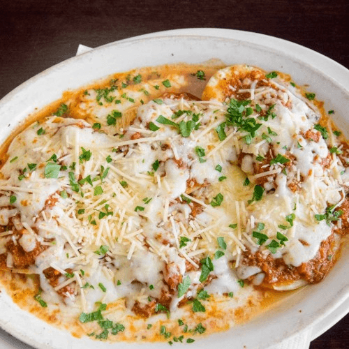 Pasta stuffed with ricotta, parmesan, spinach, ground beef, house-made bolognese sauce, and mozzarella