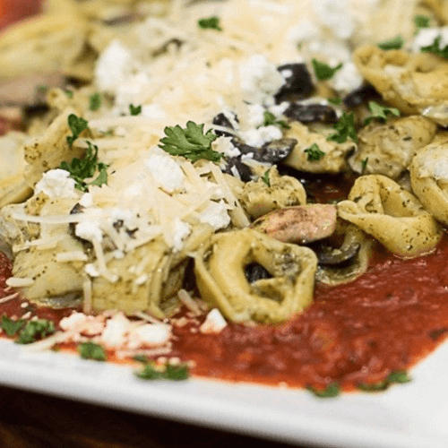 Cheese tortellini, black olives, artichoke hearts, capers, mushrooms, parmesan, feta, marinara, and pesto