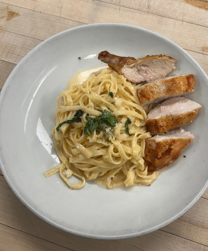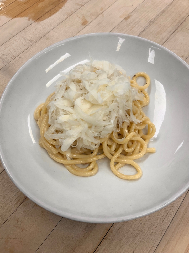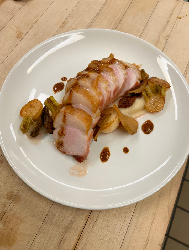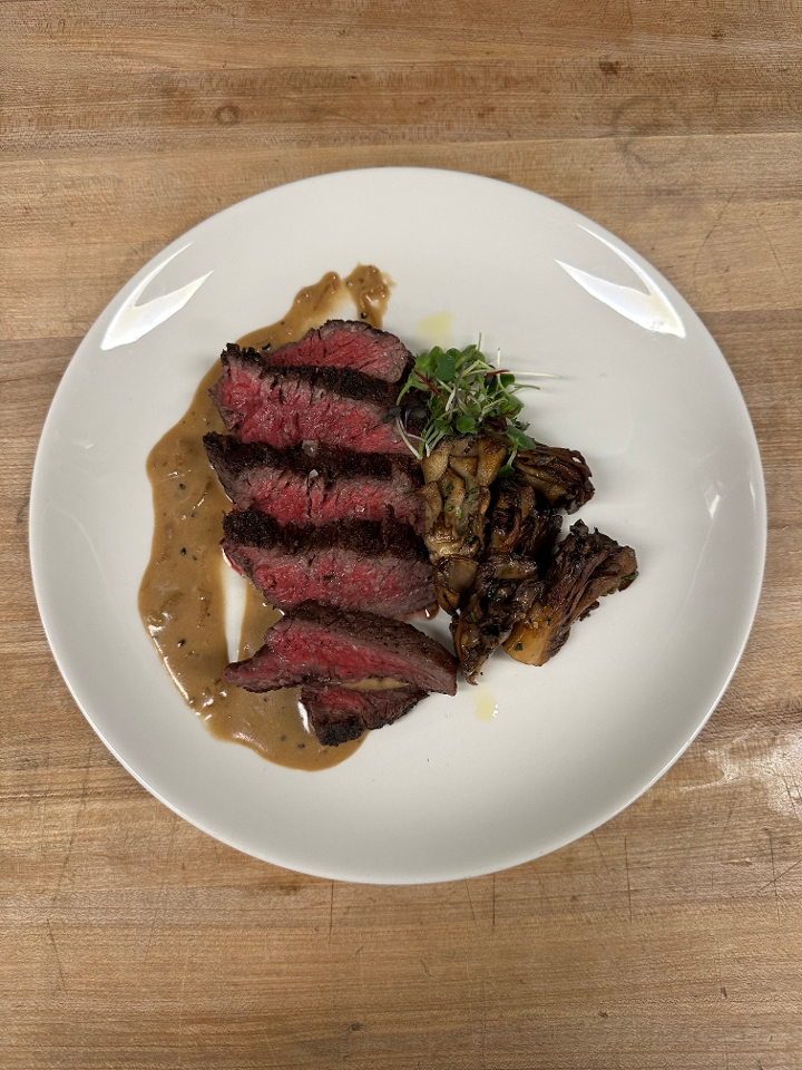 black garlic cream sauce, caramelized shallot, maitake mushroom