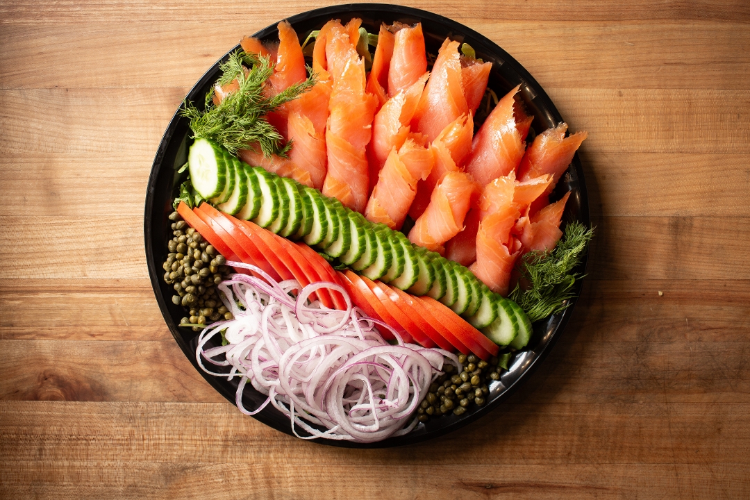 Our Lox platter will come with all the fixings to make prepare a great traditional lox bagel. Complete with 1 pound of smoked salmon and all the following: •Arugula •Sliced Tomatoes •Sliced Cucumbers •Thin Sliced Red Onion •Capers •Dill (Don't forget to order as many bagels as you will need to go with it!)
