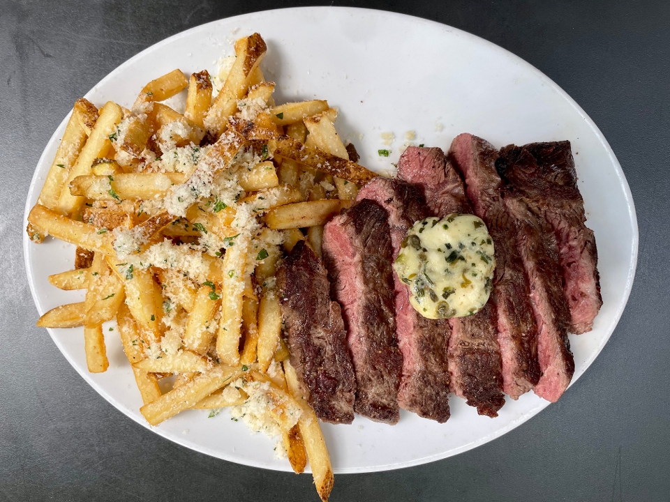 flatiron steak, herb compound butter, parmigiano fries