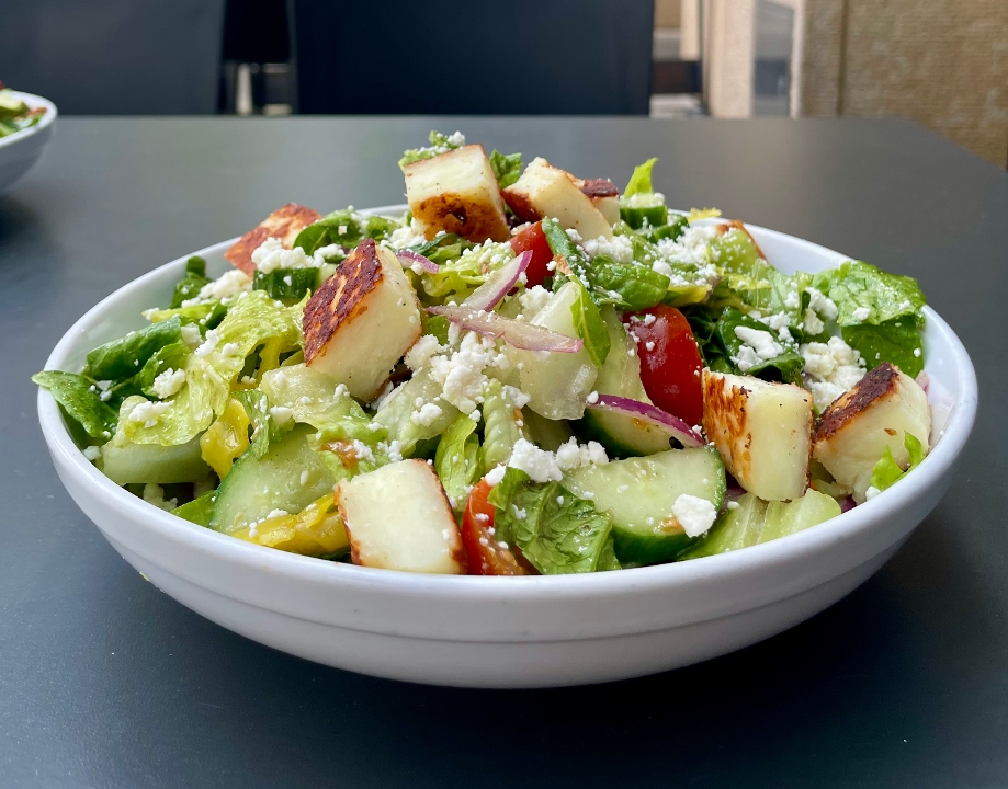 romaine lettuce, halloumi cheese, onion, cherry tomato, cucumber, pepperoncini, feta, oregano dressing