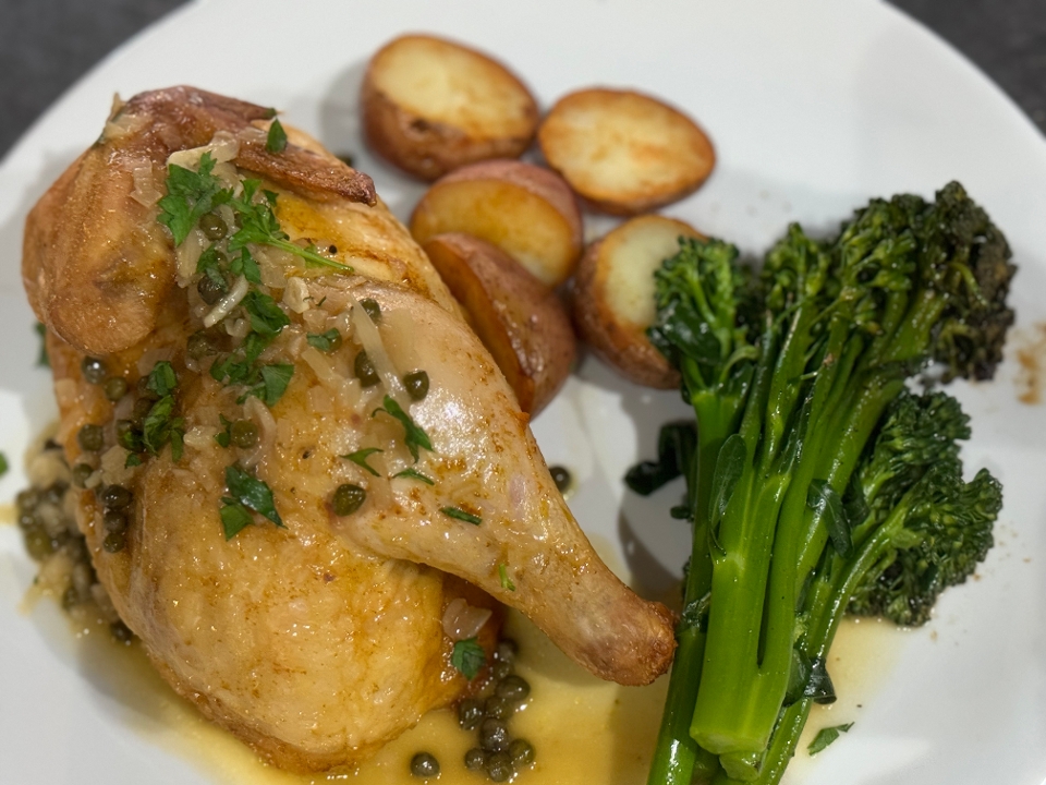 potato, broccolini, piccata sauce, capers