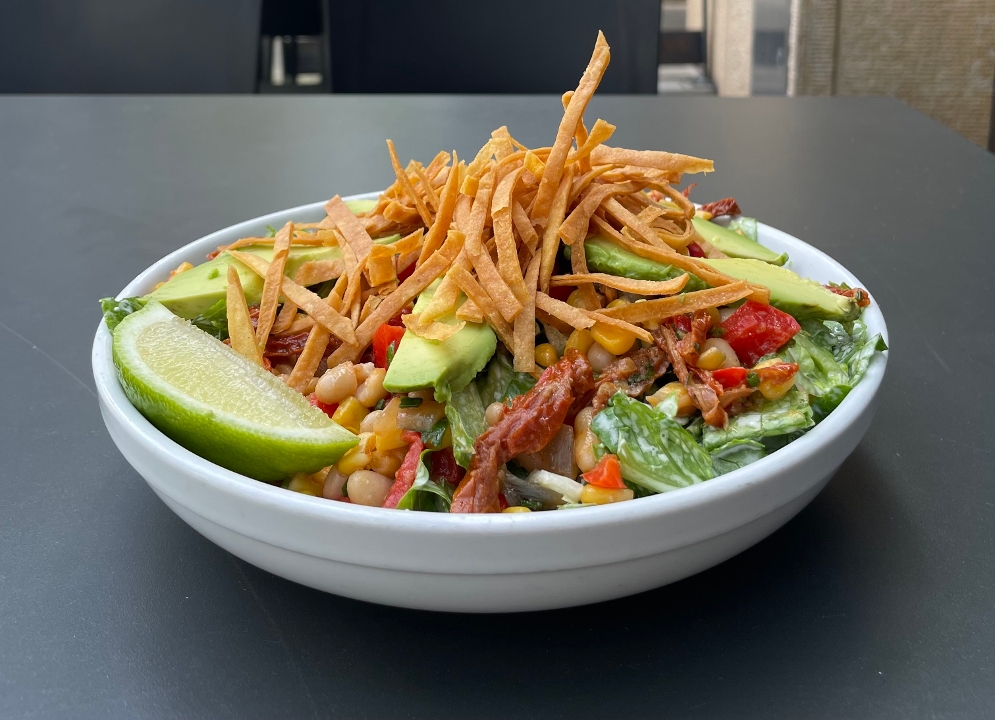 romaine lettuce, corn, cannellini bean, sundried tomato, bell pepper, cilantro, arugula, avocado, tortilla strip, ranch dressing