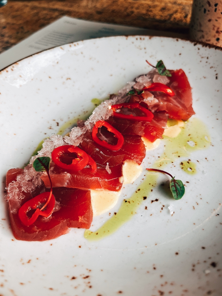 Spicy Tomato Pulp, Fried Caper, Basil, Pickled Red Onion, Pine Nut