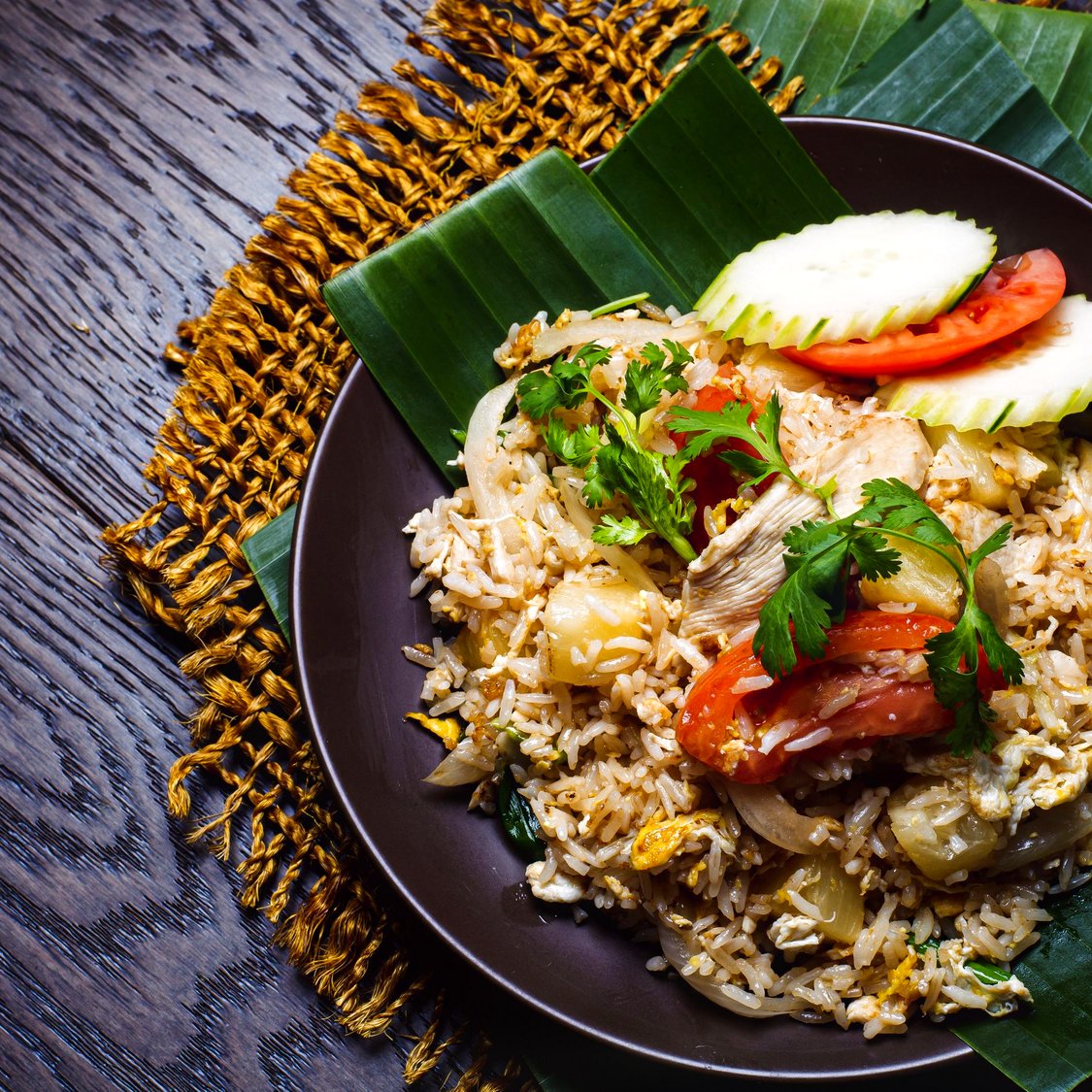 A popular Thai variation on fried rice, Jasmine rice infused with yellow curry flavor, stir-fried with pineapple, egg, tomatoes and onions. (GF) ** PARTY TRAY SIZE - GOOD FOR 4-6 PEOPLE **