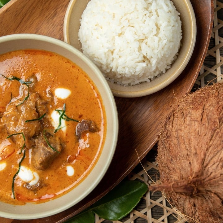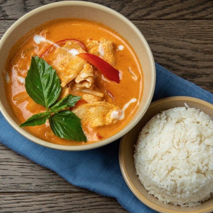 This rich curry features red chili paste, simmered with coconut milk, Kaffir lime leaves, basil, bamboo shoots and bell peppers. Served with Jasmine Rice (GF)