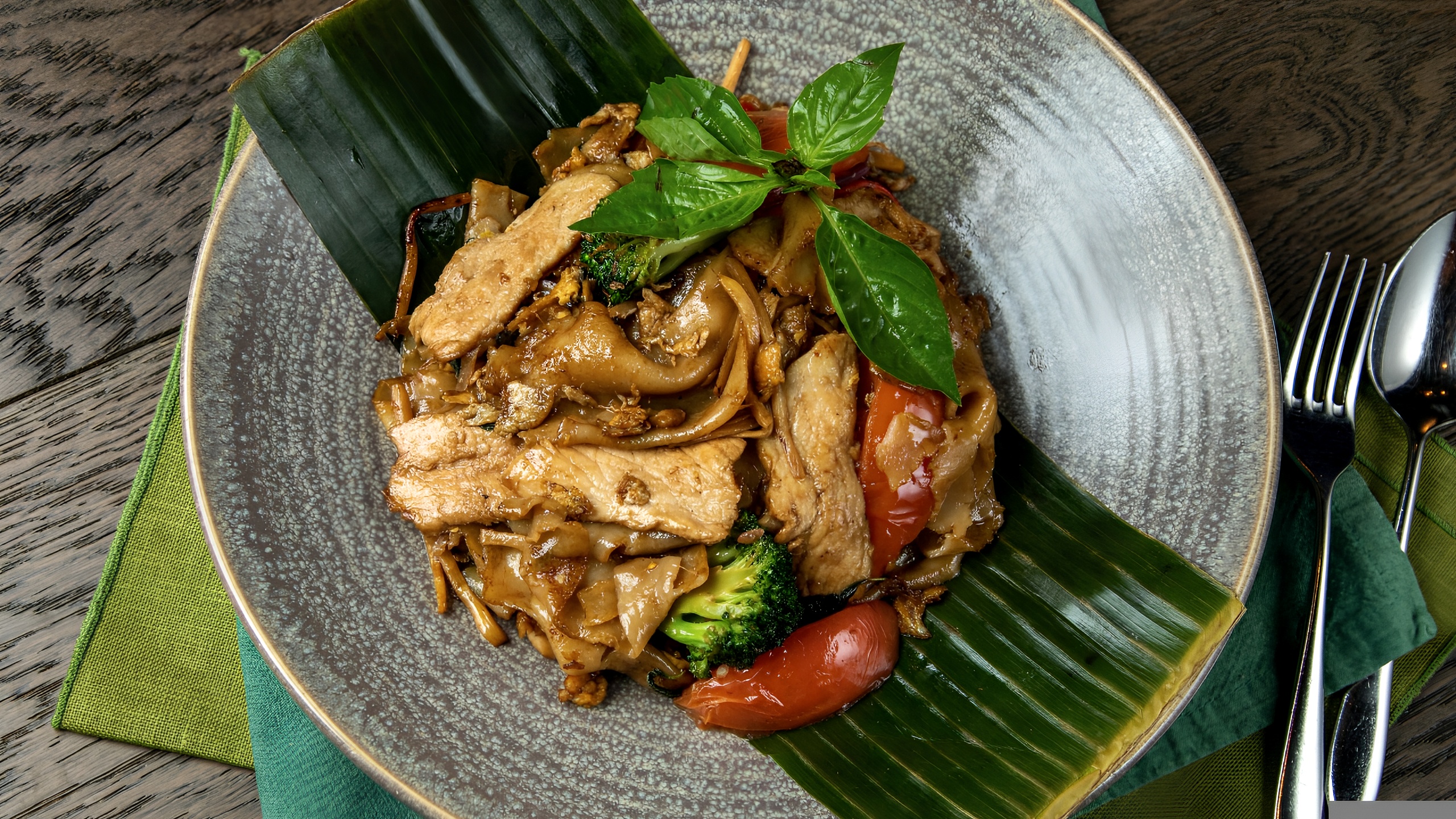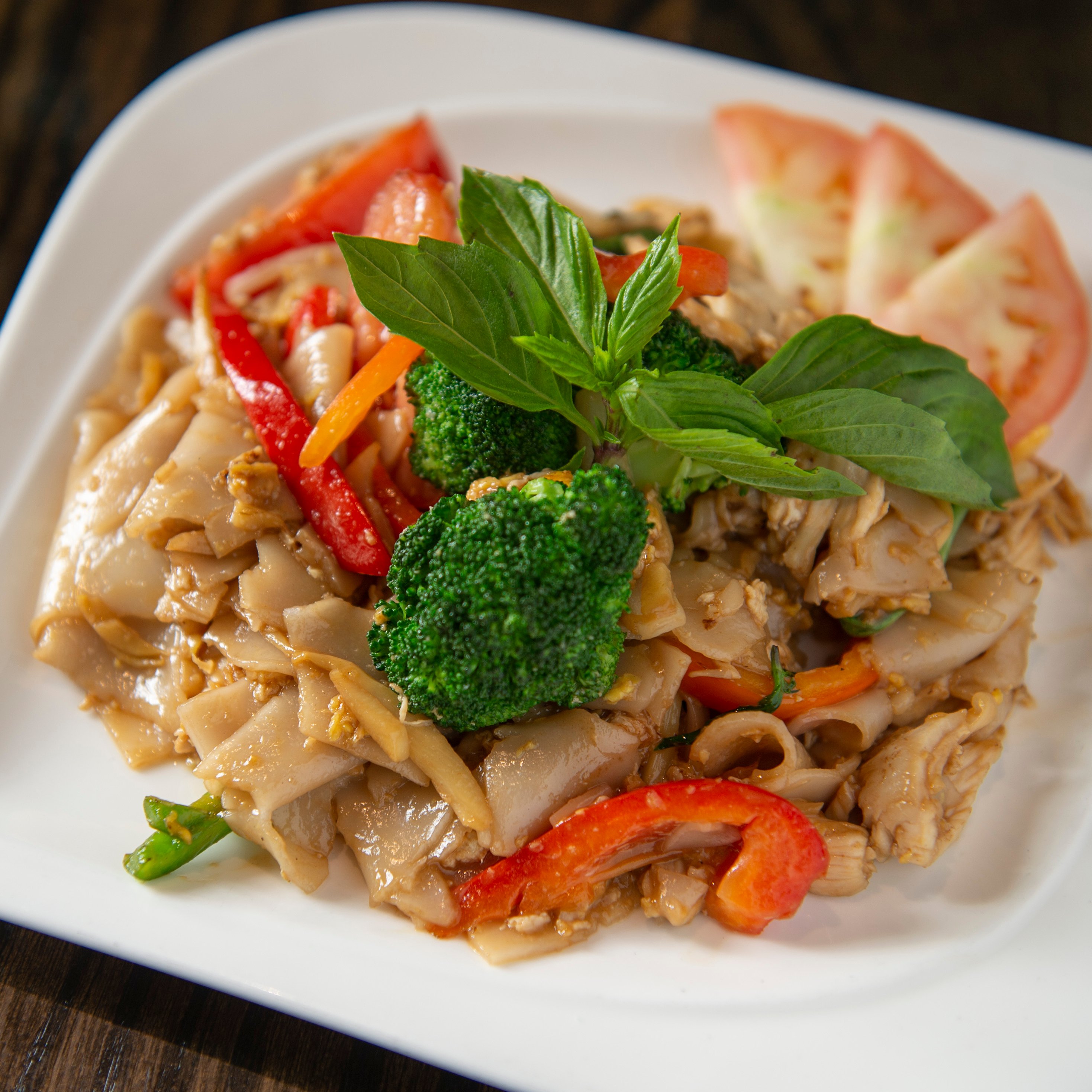 Inspired by Thai countryside tastes, these stir-fried wide rice noodles are made with egg, fresh basil, bell peppers, broccoli, bamboo shoots, tomatoes, and onions. ** PARTY TRAY SIZE - GOOD FOR 4-6 PEOPLE **